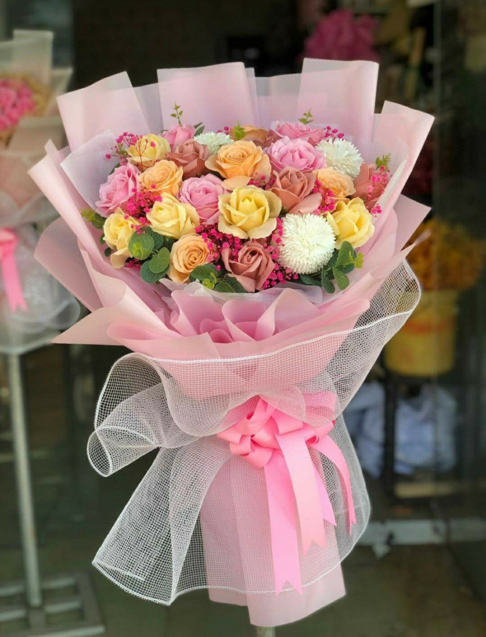Đa dạng mẫu mã: Phổ biến nhất là hoa hồng sáp (nhiều lớp, cánh tim, galaxy), còn có hướng dương sáp, tulip sáp, cẩm chướng sáp, cẩm tú cầu sáp, hoa sáp dạ quang, nhũ lấp lánh